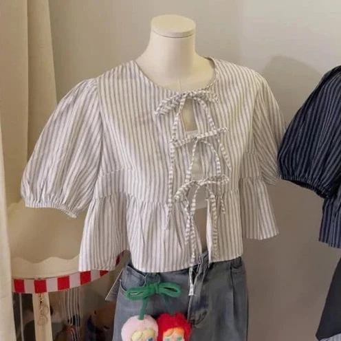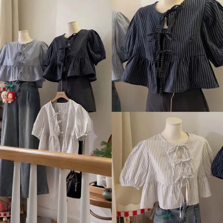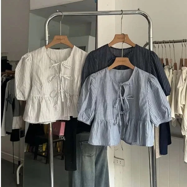 Họa tiết kẻ sọc dọc thanh mảnh, giúp người mặc trông cao và thon gọn 3 dây nơ buộc phía trước tạo điểm nhấn tiểu thư phong cách Nhật Hàn