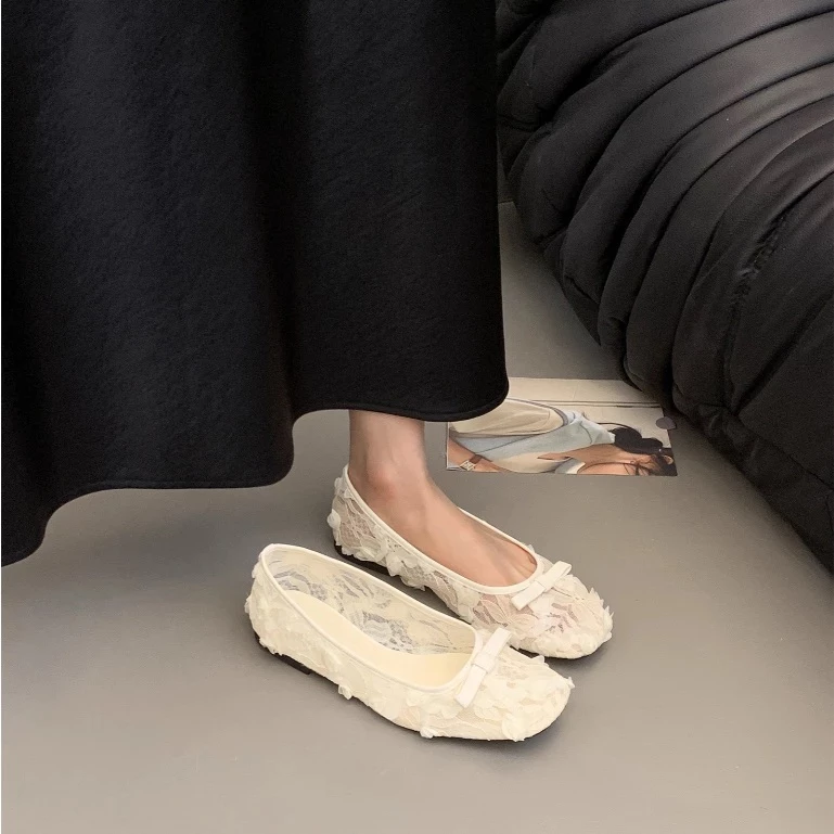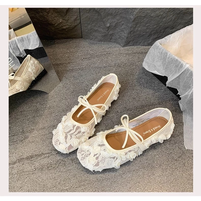 Giày Búp Bê Ren Hoa Hồng Thêu Nổi 5D – Đế Bệt Êm Chống Trượt – Dáng Tiểu Thư Dễ Thương