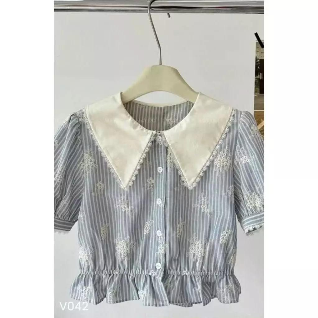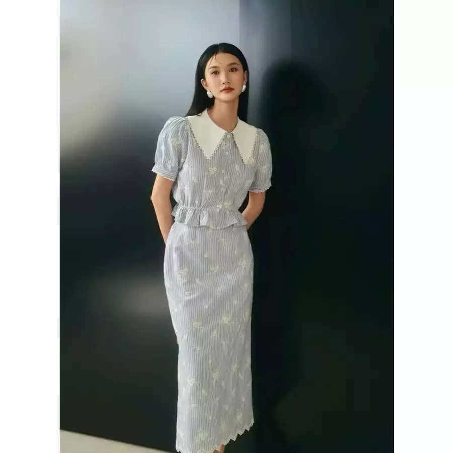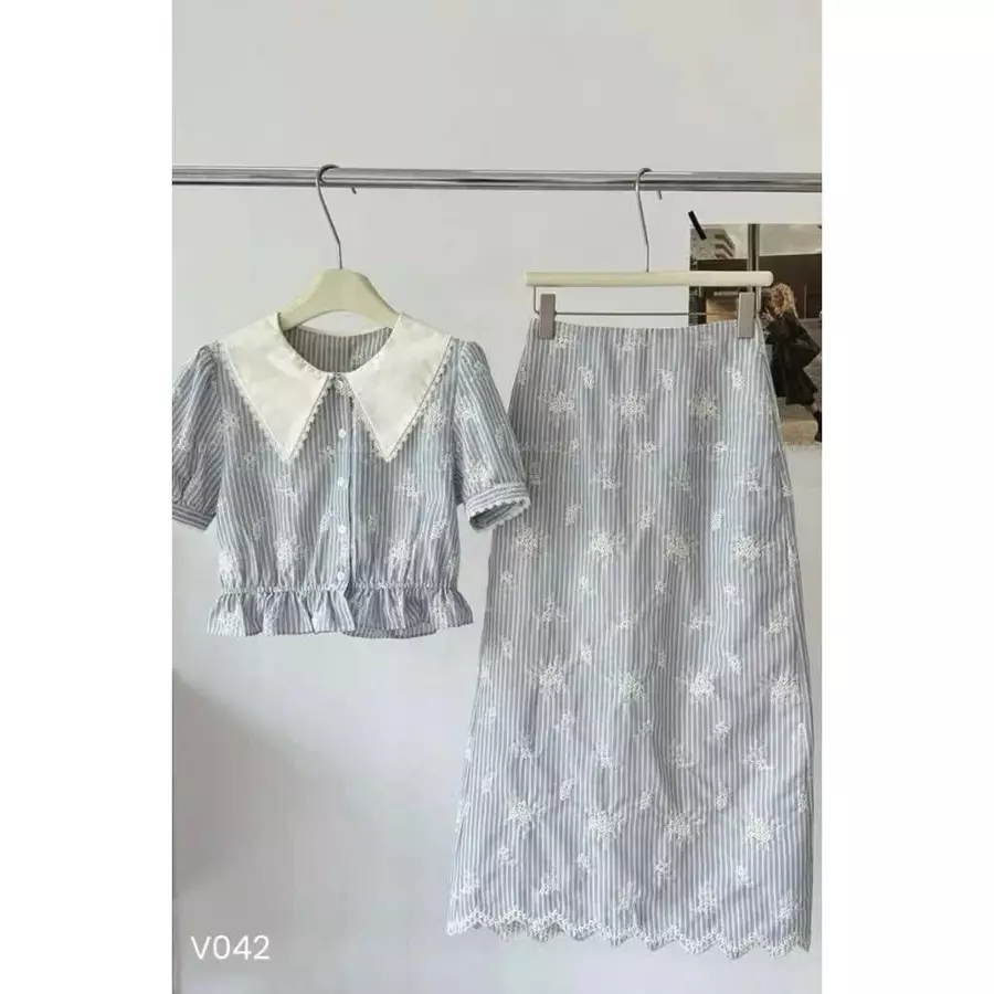 Set Áo Cổ Nhọn & Chân Váy Kẻ Sọc Xanh – Thêu Hoa Vintage
